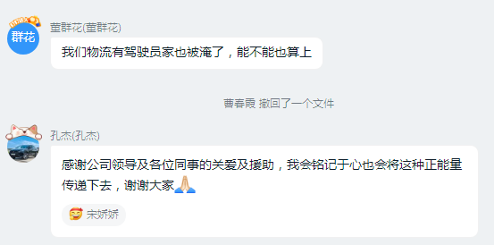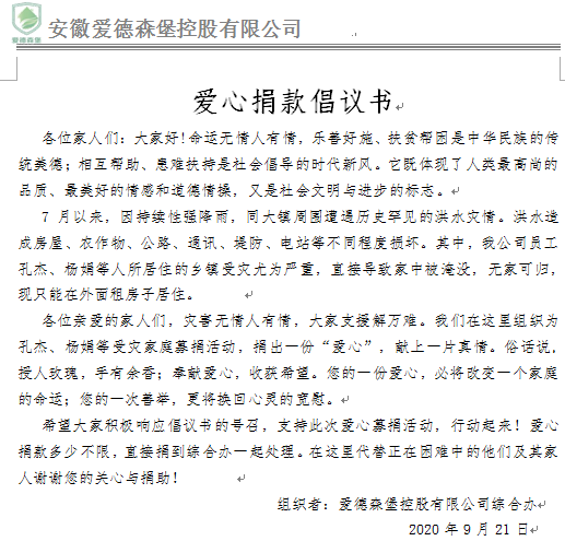 2020年7月20-28日安徽合肥廬江縣受當地持續強降雨影響,愛德森堡集團下屬子控股和物流公司的混凝土打料員楊娟(女)、銷售經理孔杰、A2半掛車駕駛員徐經伍等3名員工家中房屋遭受不同程度洪災。一經聞訊受災,愛德森堡眾人內心倍感揪心,故集團行政人事部于2020年8月發起“愛心捐款”倡議書,動員集團員工積極捐款獻愛心。