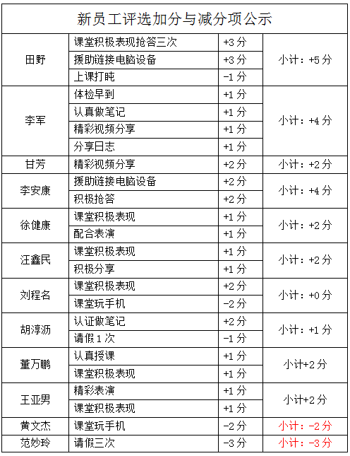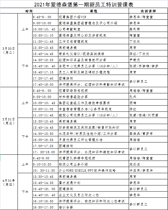 為使新員工深入了解公司文化,快速融入工作環境,增強歸屬感與責任感。集團行政人事部于2021年03月30日-4月01日在集團總部會議室組織開展了三天的“新員工特訓營活動”。本次培訓活動針對新員工、分享嘉賓及內訓講師通過參訓大眾匿名評分、現場互動加減分、課后知識點測評考試等多緯度評審,分別誕生了狀元、榜眼、探花等新秀及金銀銅牌內訓講師,現將成績公示如下:
