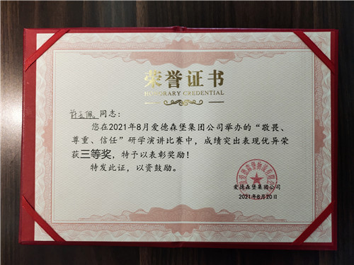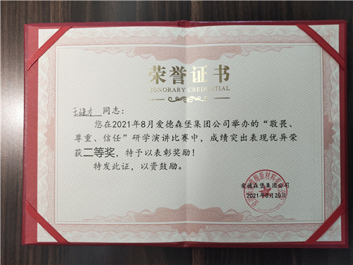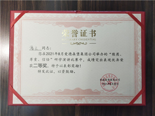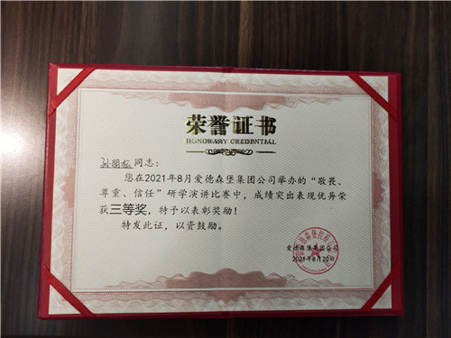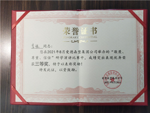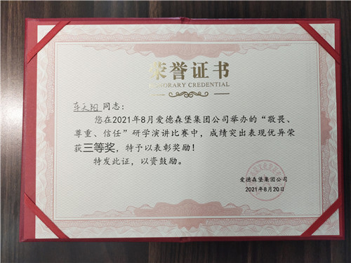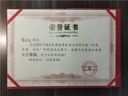 通過這次比賽,選手們鍛煉了演講能力,加深了對(duì)“敬畏、尊重、信任”六個(gè)字的認(rèn)識(shí),引發(fā)了每個(gè)人對(duì)今后工作發(fā)展的思考,這次比賽賽出了風(fēng)格,賽出了水平,更賽出了參賽員工的魅力和風(fēng)采,它不僅增進(jìn)了各子公司員工之間交流,還促進(jìn)了愛德森堡員工提供了演講口才的鍛煉,展示自我風(fēng)采的平臺(tái)。