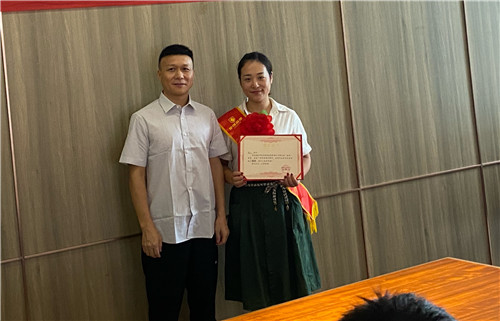 獲獎(jiǎng)?wù)邚堸i與董事長合影