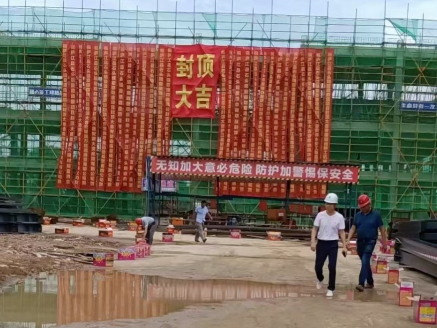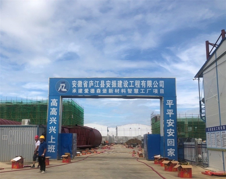 2022年7月6日上午10時58分,愛德森堡新材料有限公司于廬江縣石頭鎮舉行封頂儀式。參加封頂儀式的主要領導有:愛德森堡集團董事長黎生軍、愛德森堡新材料公司總經理陸鵬、施工方總經理吳振東。大家共同見證了工程建設開工以來讓人激動人心的階段性成果,共慶封頂大吉!