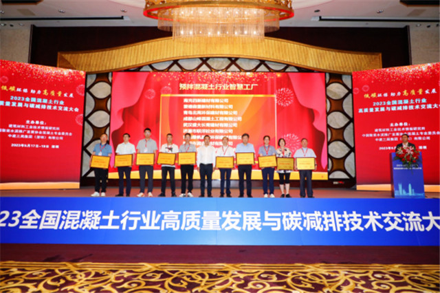 5月17至19日,由建筑材料工業技術情報研究所、中國散裝水泥推廣發展協會混凝土專業委員會、中建三局集團(深圳)有限公司主辦的“2023全國混凝土行業高質量發展與碳減排技術交流大會”在深圳市隆重召開。本次大會以“低碳環保 助力高質量發展”為主題,共邀500余位代表參加了此次盛會。愛德森堡集團副總經理黎海峰、研發事業部副總裁丁玉峰應邀參加本次會議。愛德森堡在此次會議的頒獎典禮上,榮獲“預拌混凝土行業智慧工廠”稱號。