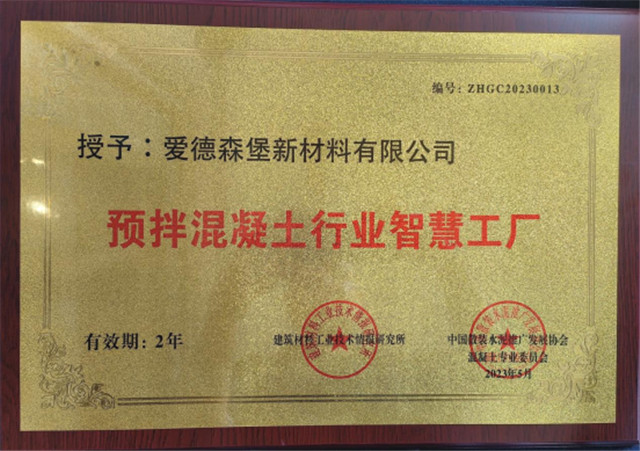 據悉,本次評選活動旨在提高混凝土行業智慧化生產標桿企業的示范作用。評價依據主要從基本要求、原材料車間建設、試驗室建設、生產車間建設、輸送和施工管理、產品性能與服務、企業榮譽等方面進行考核。“預拌混凝土行業智慧工廠”的獲得,體現了行業對愛德森堡智慧工廠現階段建設成果的認可。
